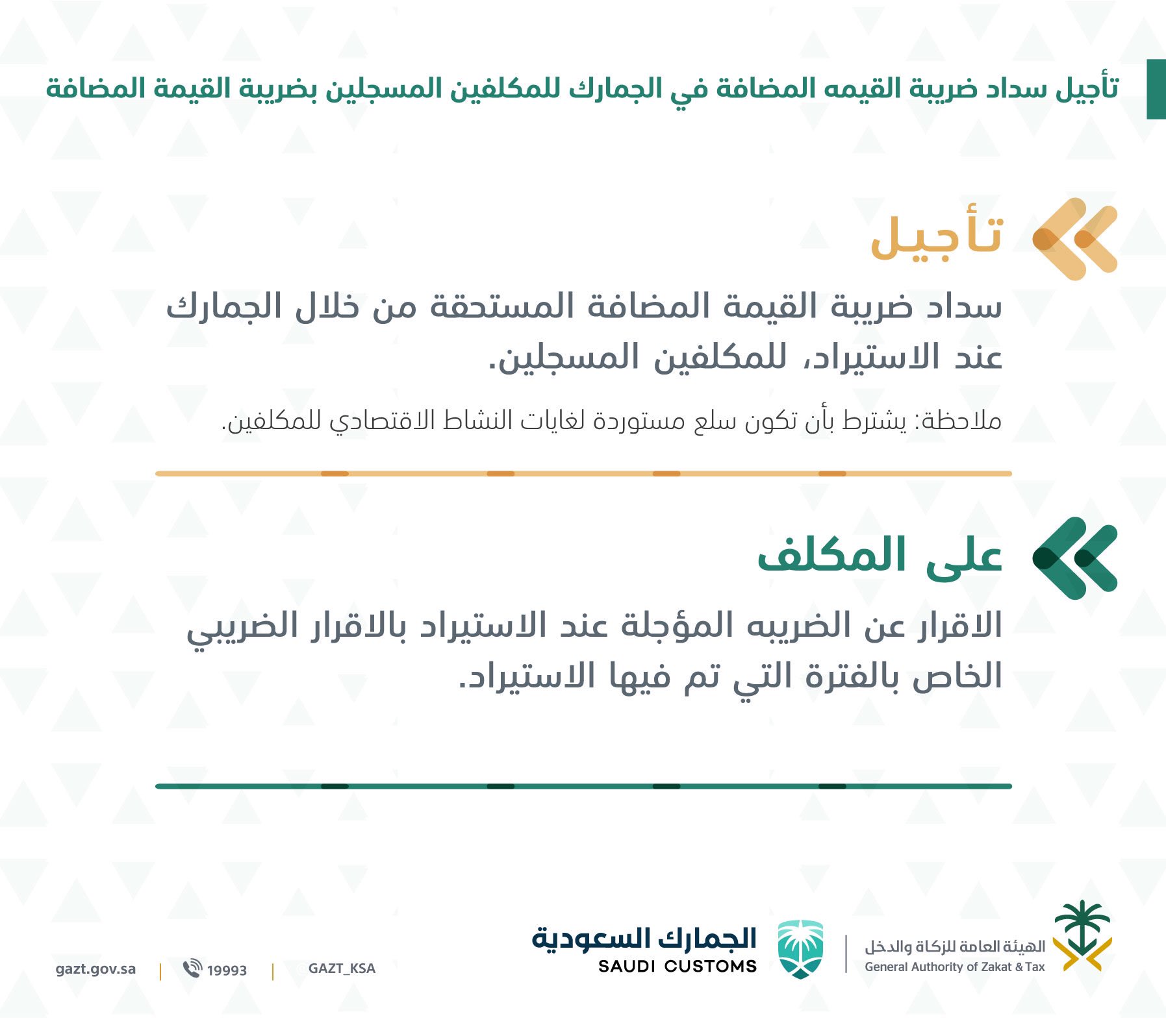 الهيئة العامة للزكاة والدخل On Twitter تعر ف على كيفية الاستفادة من تأجيل سداد ضريبة القيمة المضافة في الجمارك للمكلفين المسجلين بعد تنفيذ خطة تحفيز الاقتصاد ودعم القطاع الخاص Https T Co Qzi0uvto05