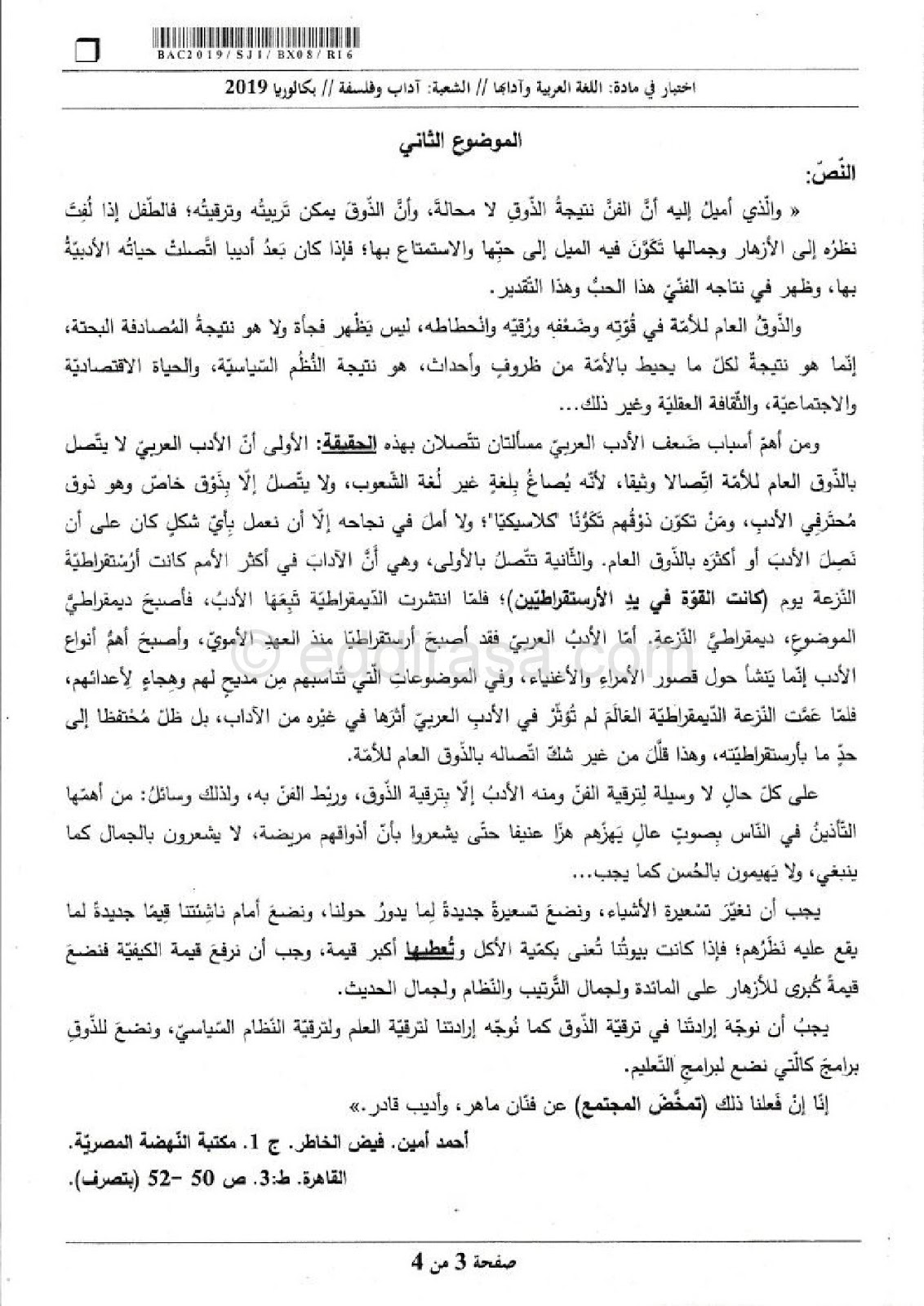 موضوع اللغة العربية بكالوريا 2019 شعبة آداب وفلسفة