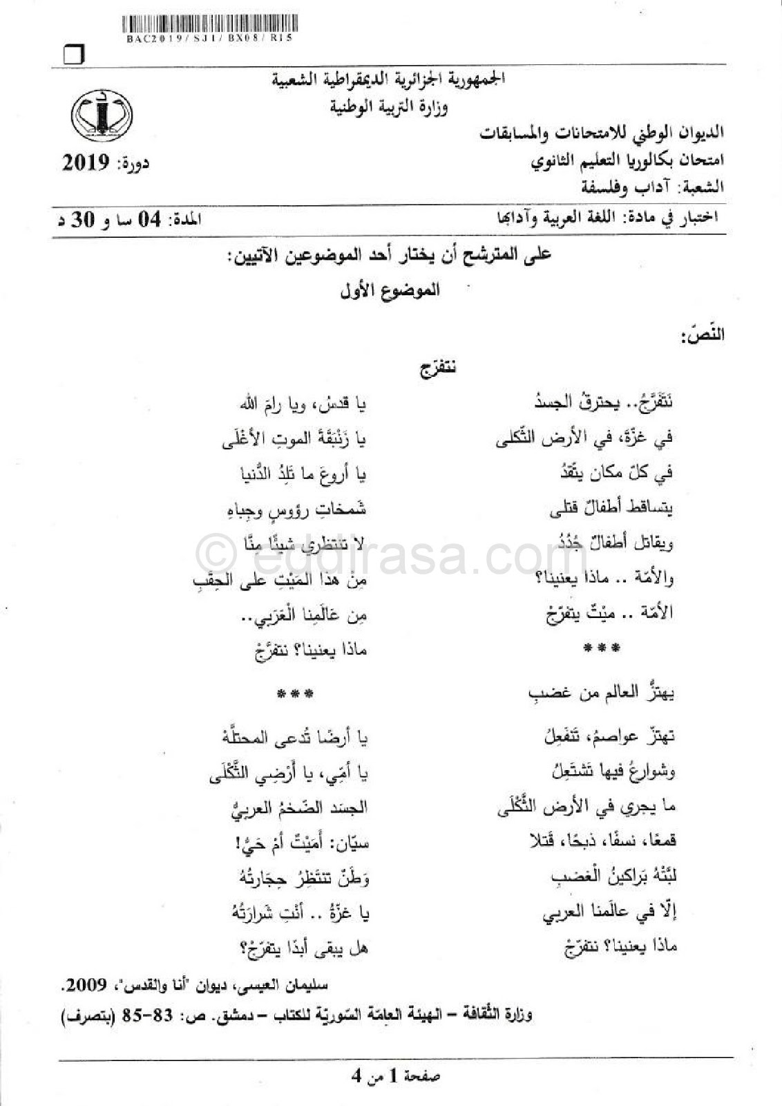 موضوع بكالوريا 2019 في اللغة العربية شعبة آداب و فلسفة موقع الدراسة الجزائري