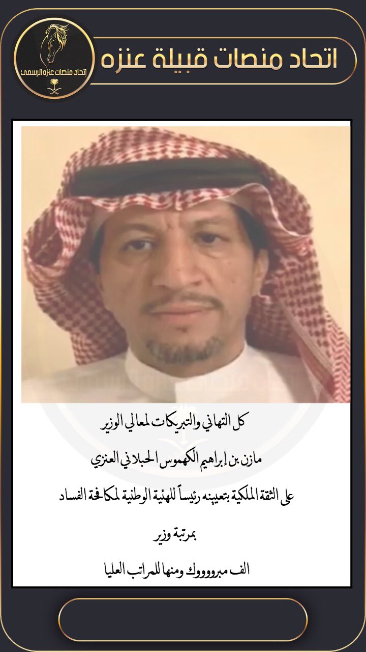 إتحاد منصات عنزه الرسمي A Twitter كل التهاني والتبريكات لمعالي الوزير مازن بن إبراهيم الكهموس الحبلاني العنزي على الثقة الملكية بتعيينه رئيسا للهئية الوطنية لمكافحة الفساد بمرتبة وزير الف مبرووووك ومنها للمراتب