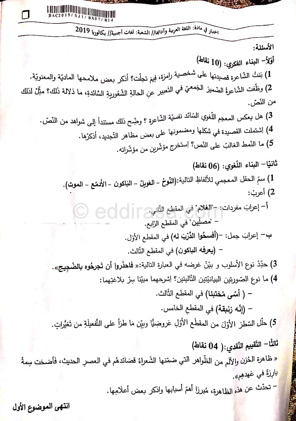 موضوع اللغة العربية بكالوريا 2019 لغات أجنبية Bac 2019