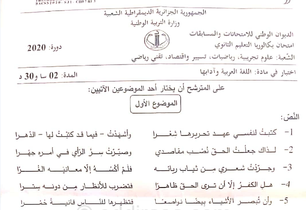 موضوع اللغة العربية بكالوريا 2020 شعب علمية موقع الدراسة الجزائري