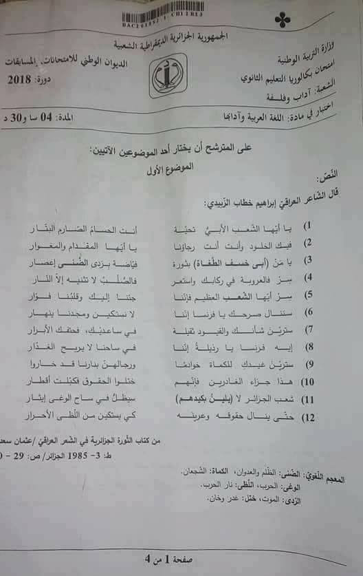موضوع اللغة العربية بكالوريا 2018 شعبة آداب وفلسفة
