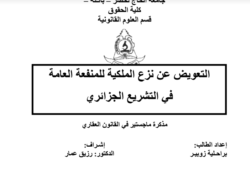 التعويض عن نزع الملكية للمنفعة العامة في التشريع الجزائري رسالة ماجستير Pdf