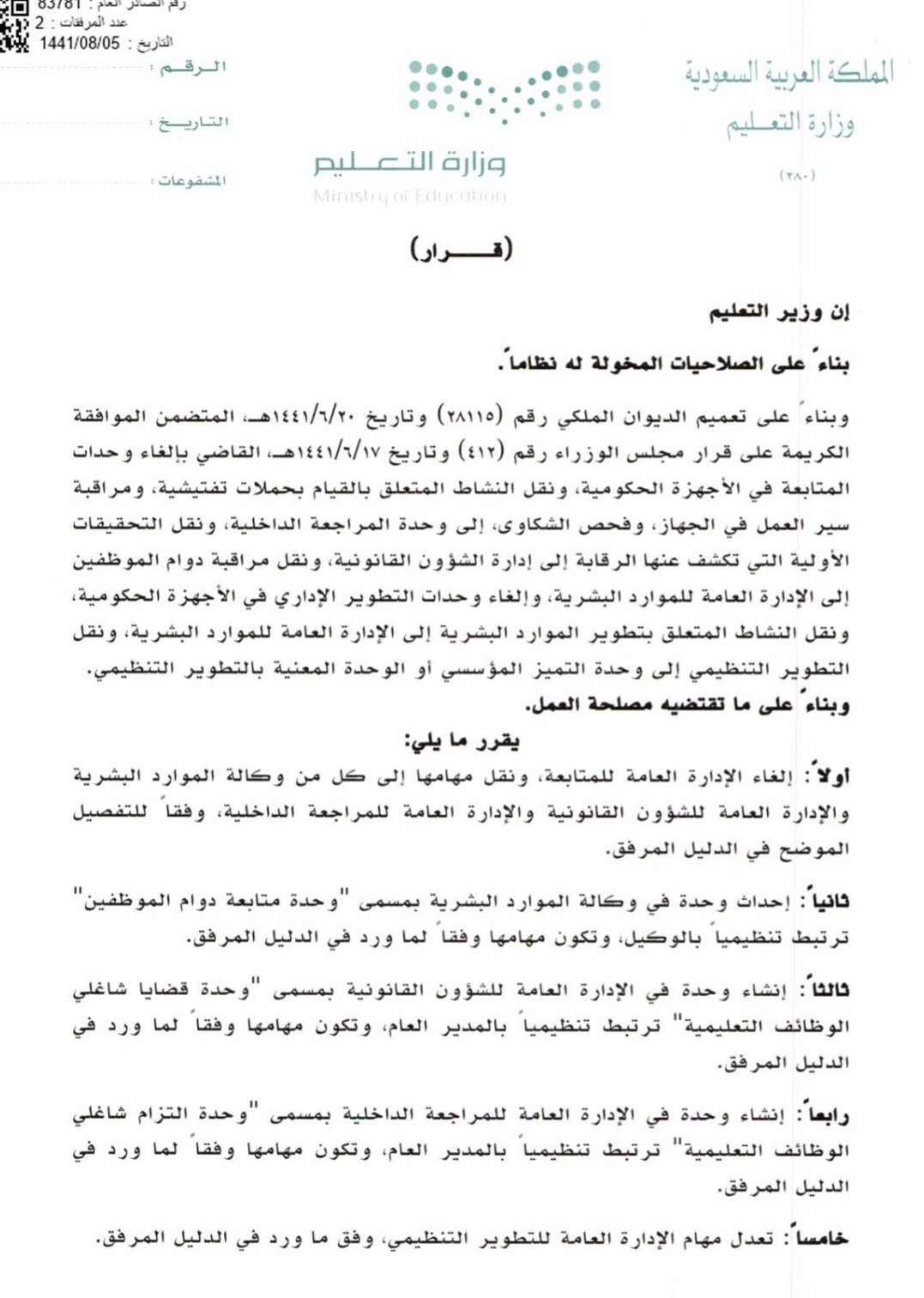 اعتمد وزير التعليم الدكتور حمد آل الشيخ بإنشاء وحدة لمتابعة دوام الموظفين بوكالة الموارد البشرية وكذلك إنشاء وحدة في الإدارة العامة للشؤون القانونية بمسمى وحدة قضايا شاغلي الوظائف التعليمية وإنشاء وحدة في.