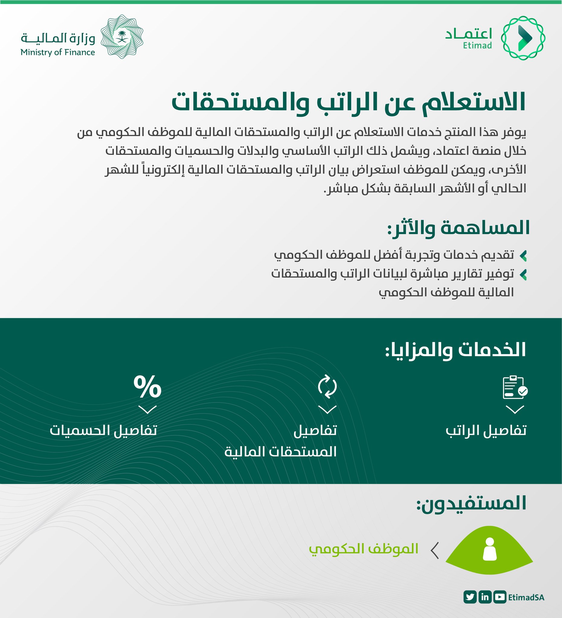 وزارة المالية السعودية On Twitter يمكن للموظف الحكومي الاطلاع على بيانات الراتب الأساسي والمستحقات المالية من خلال منتج الاستعلام عن الراتب والمستحقات في منصة اعتماد منتجات اعتماد الجديدة المالية السعودية منصة اعتماد Hrsd Sa Https T Co