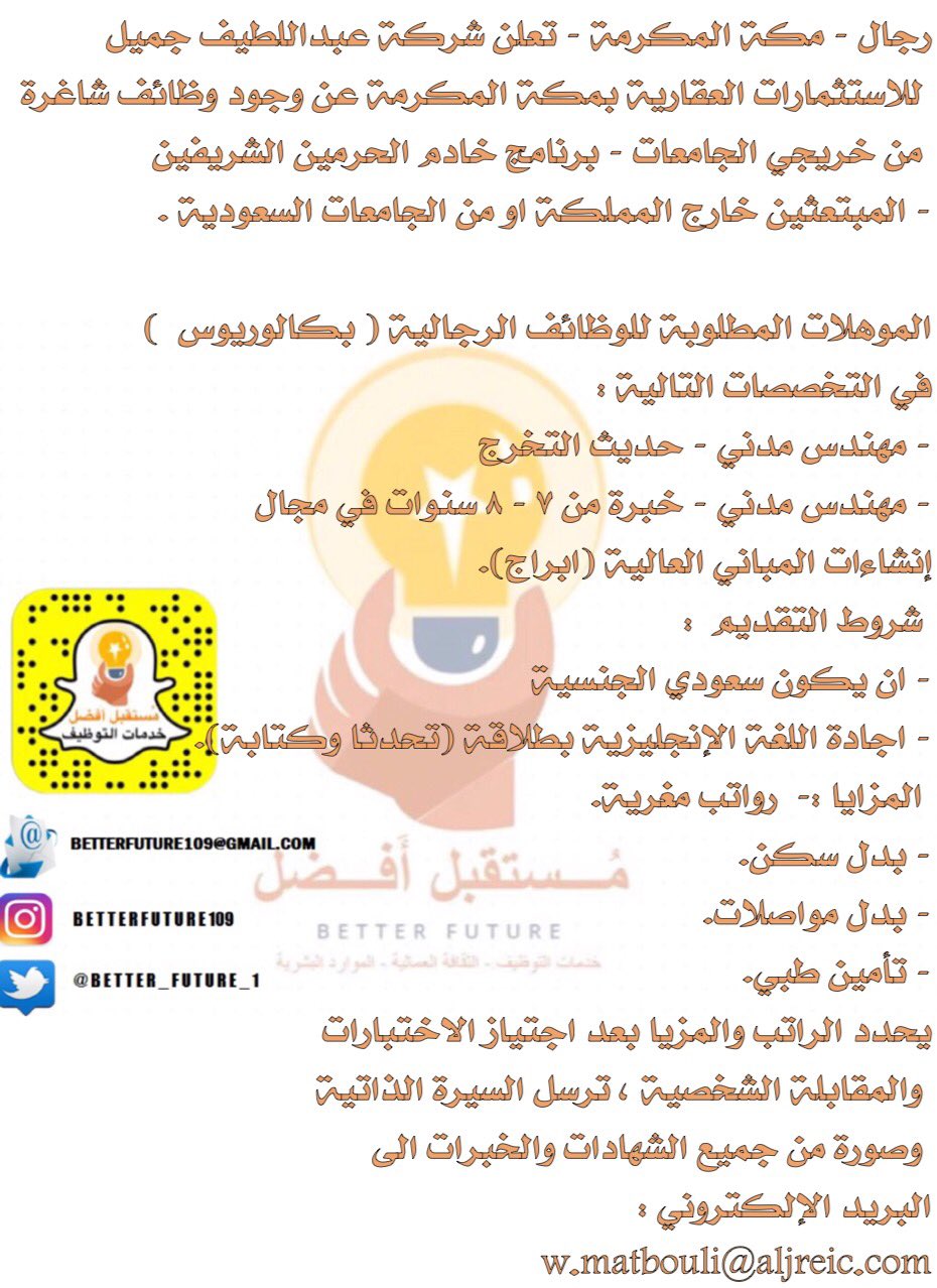 م ستقبل أ فضل Betterfuture On Twitter رجال مكة المكرمة تعلن شركة عبداللطيف جميل للأستثمارات العقارية عن حاجتها مهندس مدني وظائف مكة
